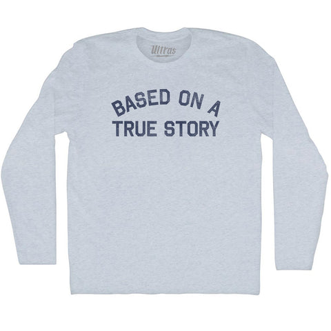 Product Story: Based On A True Story Adult Tri-Blend Long Sleeve T-shirtProduct Description: Based On A True Story Adult Tri-Blend Long Sleeve T-shirt Tri-Blend (Polyester, Rayon, Cotton) Buttery Smooth Soft Material Medium Weight Tee Soft Hand Print