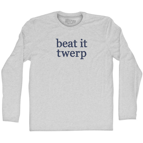 Product Story: Beat It Twerp Rage Font Adult Tri-Blend Long Sleeve T-shirtProduct Description: Beat It Twerp Rage Font Adult Tri-Blend Long Sleeve T-shirt Tri-Blend (Polyester, Rayon, Cotton) Buttery Smooth Soft Material Medium Weight Tee Soft Hand Print