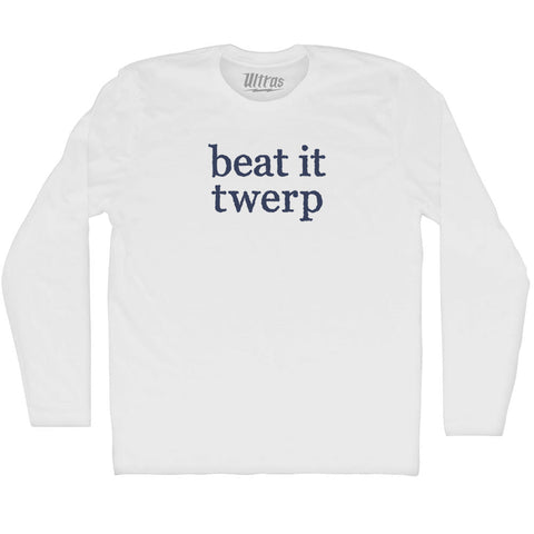 Product Story: Beat It Twerp Rage Font Adult Cotton Long Sleeve T-shirtProduct Description: Beat It Twerp Rage Font Adult Cotton Long Sleeve T-shirt Cotton (90% Cotton &10% Polyester) Buttery Smooth Soft Material Medium Weight Tee Soft Hand Print