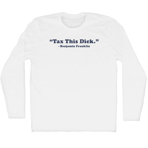 Product Story: Benjamin Franklin Tax This Dick Quote Adult Cotton Long Sleeve T-shirtProduct Description: Benjamin Franklin Tax This Dick Quote Adult Cotton Long Sleeve T-shirt Cotton Buttery Smooth Soft Material Medium Weight Tee Soft Hand Print