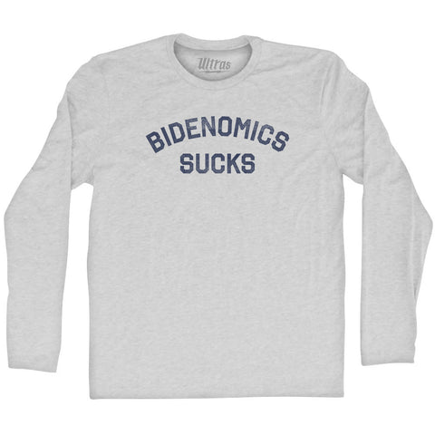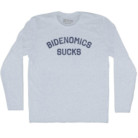 Product Story: Bidenomics Sucks Adult Tri-Blend Long Sleeve T-shirtProduct Description: Bidenomics Sucks Adult Tri-Blend Long Sleeve T-shirt Tri-Blend (Polyester, Rayon, Cotton) Buttery Smooth Soft Material Medium Weight Tee Soft Hand Print