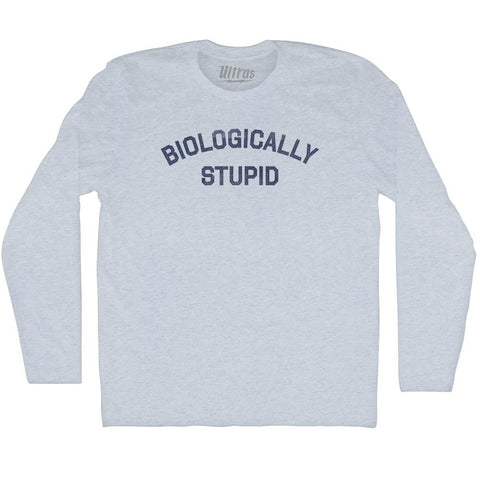 Product Story: Biologically Stupid Adult Tri-Blend Long Sleeve T-shirtProduct Description: Biologically Stupid Adult Tri-Blend Long Sleeve T-shirt Tri-Blend (Polyester, Rayon, Cotton) Buttery Smooth Soft Material Medium Weight Tee Soft Hand Print