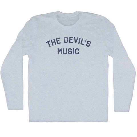 Product Story: The Devil's Music Adult Tri-Blend Long Sleeve T-shirtProduct Description: The Devil's Music Adult Tri-Blend Long Sleeve T-shirt Tri-Blend (Polyester, Rayon, Cotton) Buttery Smooth Soft Material Medium Weight Tee Soft Hand Print