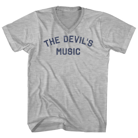 Product Story: The Devil's Music Adult Cotton V-neck T-shirtProduct Description: The Devil's Music Adult Cotton V-neck T-shirt Tri-Blend (Polyester, Rayon, Cotton)