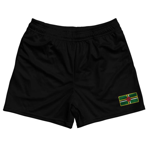 Product Story: Dominica Country Heritage Flag Rugby Gym Short 5 Inch Inseam With Pockets Made In USA Product Description: Dominica Country Heritage Flag Rugby Gym Short 5 Inch Inseam With Pockets Made In USA Polyester Sublimated Vibrant Print Premium Micro Fiber Side Pockets 4.5 Inch Inseam Elastic Drawstring Made in USA