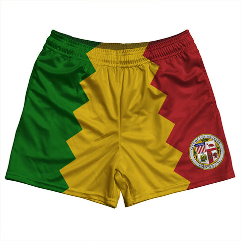 Product Story: Los Angeles Rugby Shorts Made In USAProduct Description: Los Angeles Rugby Shorts Made In USA Rep your, state, country or tribe in these fun Ruckus Rugby shorts. Rugby Shorts Polyester Sublimated Vibrant Print Premium Micro Fiber Side Pockets 4.5 Inch Inseam Elastic Drawstring Made In USA