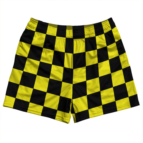 Product Story: Checkerboard 2.5 Inches Black and Yellow Rugby Shorts Made In USAProduct Description: Checkerboard 2.5 Inches Black and Yellow Rugby Shorts Made In USA Rep your, state, country or tribe in these fun Ruckus Rugby shorts. Rugby Shorts Polyester Sublimated Vibrant Print Premium Micro Fiber Side Pockets 4.5 Inch Inseam Elastic Drawstring Made In USA