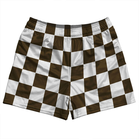 Product Story: Checkerboard 2.5 Inches Brown Dark and White Rugby Shorts Made In USAProduct Description: Checkerboard 2.5 Inches Brown Dark and White Rugby Shorts Made In USA Rep your, state, country or tribe in these fun Ruckus Rugby shorts. Rugby Shorts Polyester Sublimated Vibrant Print Premium Micro Fiber Side Pockets 4.5 Inch Inseam Elastic Drawstring Made In USA
