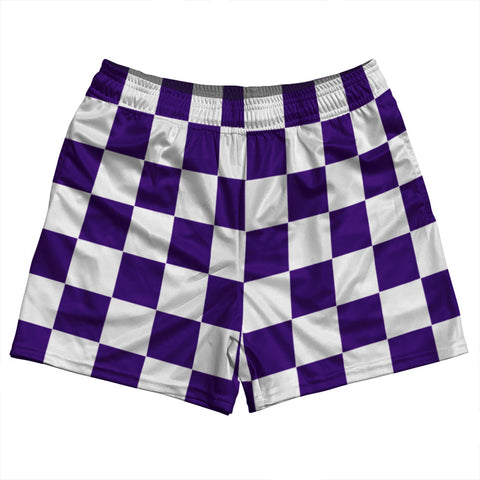 Product Story: Checkerboard 2.5 Inches Purple Lakers and White Rugby Shorts Made In USAProduct Description: Checkerboard 2.5 Inches Purple Lakers and White Rugby Shorts Made In USA Rep your, state, country or tribe in these fun Ruckus Rugby shorts. Rugby Shorts Polyester Sublimated Vibrant Print Premium Micro Fiber Side Pockets 4.5 Inch Inseam Elastic Drawstring Made In USA
