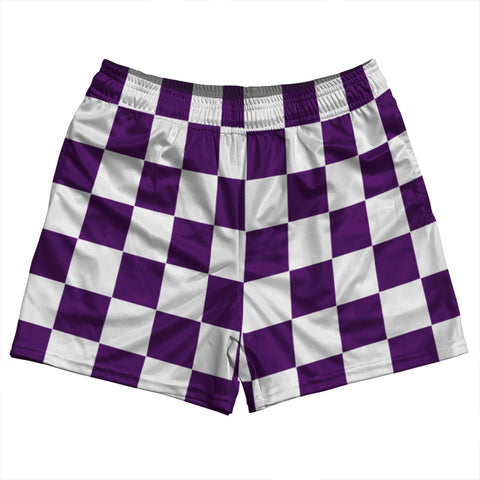 Product Story: Checkerboard 2.5 Inches Purple Medium and White Rugby Shorts Made In USAProduct Description: Checkerboard 2.5 Inches Purple Medium and White Rugby Shorts Made In USA Rep your, state, country or tribe in these fun Ruckus Rugby shorts. Rugby Shorts Polyester Sublimated Vibrant Print Premium Micro Fiber Side Pockets 4.5 Inch Inseam Elastic Drawstring Made In USA