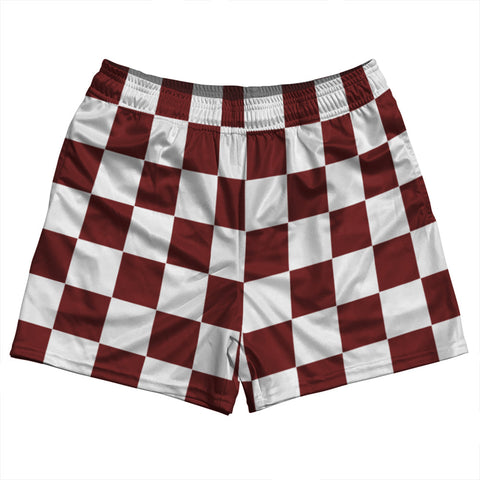 Product Story: Checkerboard 2.5 Inches Red Maroon and White Rugby Shorts Made In USAProduct Description: Checkerboard 2.5 Inches Red Maroon and White Rugby Shorts Made In USA Rep your, state, country or tribe in these fun Ruckus Rugby shorts. Rugby Shorts Polyester Sublimated Vibrant Print Premium Micro Fiber Side Pockets 4.5 Inch Inseam Elastic Drawstring Made In USA