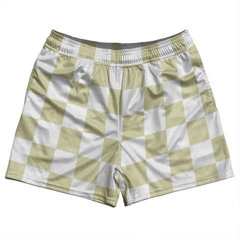 Product Story: Checkerboard 2.5 Inches Vegas Gold and White Rugby Shorts Made In USAProduct Description: Checkerboard 2.5 Inches Vegas Gold and White Rugby Shorts Made In USA Rep your, state, country or tribe in these fun Ruckus Rugby shorts. Rugby Shorts Polyester Sublimated Vibrant Print Premium Micro Fiber Side Pockets 4.5 Inch Inseam Elastic Drawstring Made In USA