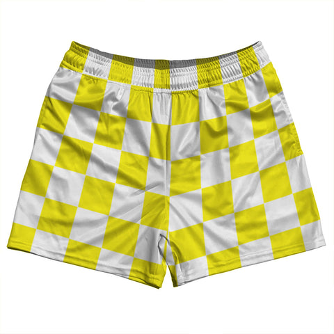 Product Story: Checkerboard 2.5 Inches Yellow Bright and White Rugby Shorts Made In USAProduct Description: Checkerboard 2.5 Inches Yellow Bright and White Rugby Shorts Made In USA Rep your, state, country or tribe in these fun Ruckus Rugby shorts. Rugby Shorts Polyester Sublimated Vibrant Print Premium Micro Fiber Side Pockets 4.5 Inch Inseam Elastic Drawstring Made In USA