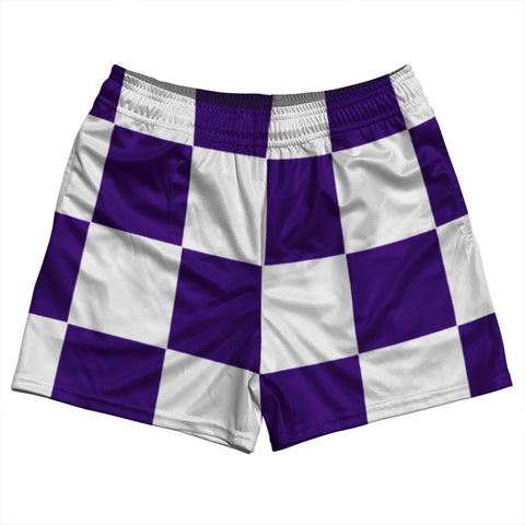 Product Story: Checkerboard 5 Inches Purple Medium and White Rugby Shorts Made In USAProduct Description: Checkerboard 5 Inches Purple Medium and White Rugby Shorts Made In USA Rep your, state, country or tribe in these fun Ruckus Rugby shorts. Rugby Shorts Polyester Sublimated Vibrant Print Premium Micro Fiber Side Pockets 4.5 Inch Inseam Elastic Drawstring Made In USA