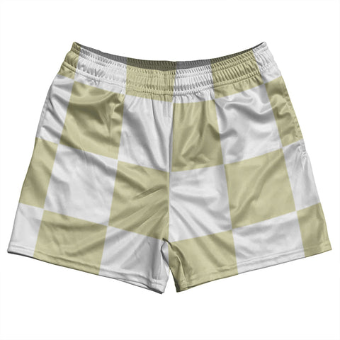 Product Story: Checkerboard 5 Inches Vegas Gold and White Rugby Shorts Made In USAProduct Description: Checkerboard 5 Inches Vegas Gold and White Rugby Shorts Made In USA Rep your, state, country or tribe in these fun Ruckus Rugby shorts. Rugby Shorts Polyester Sublimated Vibrant Print Premium Micro Fiber Side Pockets 4.5 Inch Inseam Elastic Drawstring Made In USA