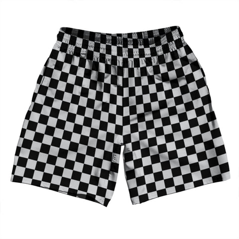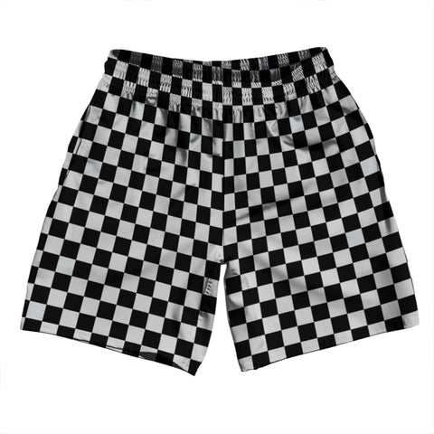 Product Story: Checkerboard 1 Inch Black and Grey Medium Swim Shorts 7" Made in USAProduct Description: Checkerboard 1 Inch Black and Grey Medium Swim Shorts 7" Made in USA 7'' Inseam & 20" Tall Swim Trunks Board Shorts Bathing Suits Swim Suits Quick Drying Material Stretch Polyester Elastic Waistband Drawstring Side Pockets Made In USA