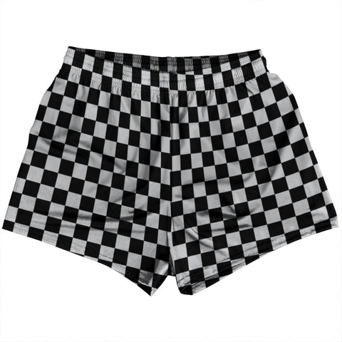 Product Story: Checkerboard 1 Inch Black and Grey Medium Womens & Girls Sport Shorts End Made In USAProduct Description: Checkerboard 1 Inch Black and Grey Medium Womens & Girls Sport Shorts End Made In USA Athletic Shorts Micro-Fiber Polyester Cooling Material Premium Lacrosse Product Elastic Drawstring Made in USA