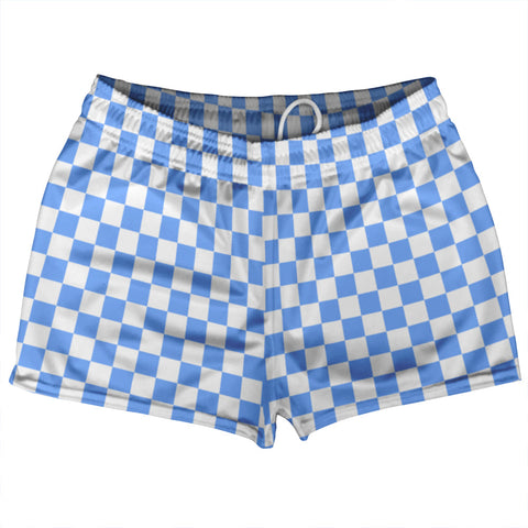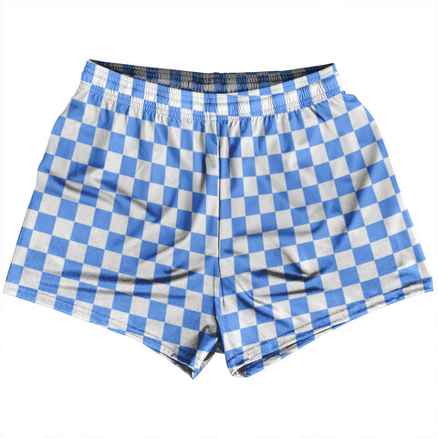 Product Story: Checkerboard 1 Inch Blue Carolina and White Shorty Short Gym Shorts 2.5" Inseam Made In USAProduct Description: Checkerboard 1 Inch Blue Carolina and White Shorty Short Gym Shorts 2.5" Inseam Made In USA Men's Short Shorts 2.5 Inseam No Pockets Athletic Microfiber Great For Inspiring Baby Making, Rugby, Running, Hoops, Racket Sports, Gym Class and Basket Weaving. Draw...