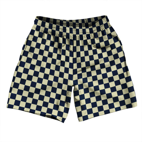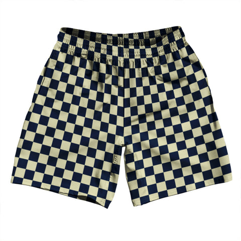 Product Story: Checkerboard 1 Inch Blue Navy and Vegas Gold Swim Shorts 7" Made in USAProduct Description: Checkerboard 1 Inch Blue Navy and Vegas Gold Swim Shorts 7" Made in USA 7'' Inseam & 20" Tall Swim Trunks Board Shorts Bathing Suits Swim Suits Quick Drying Material Stretch Polyester Elastic Waistband Drawstring Side Pockets Made In USA