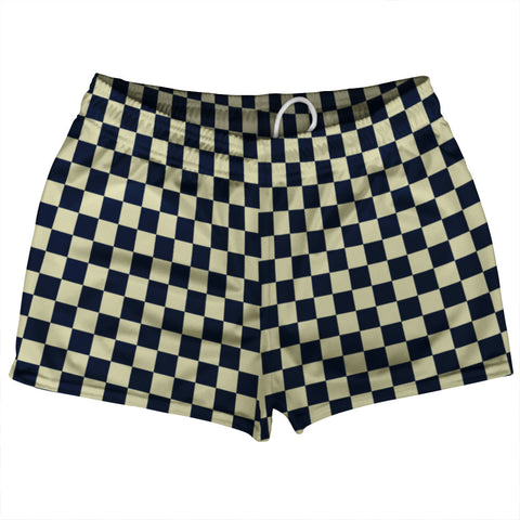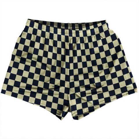 Product Story: Checkerboard 1 Inch Blue Navy and Vegas Gold Shorty Short Gym Shorts 2.5" Inseam Made In USAProduct Description: Checkerboard 1 Inch Blue Navy and Vegas Gold Shorty Short Gym Shorts 2.5" Inseam Made In USA Men's Short Shorts 2.5 Inseam No Pockets Athletic Microfiber Great For Inspiring Baby Making, Rugby, Running, Hoops, Racket Sports, Gym Class and Basket...