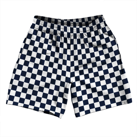 Product Story: Checkerboard 1 Inch Blue Navy and White 2.5" Swim Shorts Made in USAProduct Description: Checkerboard 1 Inch Blue Navy and White 2.5" Swim Shorts Made in USA Stripe 2.50" Inseam Swim Shorts Swim Trunks Board Shorts Bathing Suits Swim Suits Quick Drying Material Stretch Polyester Elastic Waistband Drawstring Side Pockets Made In USA