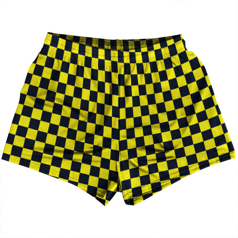 Product Story: Checkerboard 1 Inch Blue Navy and Yellow Canary Shorty Short Gym Shorts 2.5" Inseam Made In USAProduct Description: Checkerboard 1 Inch Blue Navy and Yellow Canary Shorty Short Gym Shorts 2.5" Inseam Made In USA Men's Short Shorts 2.5 Inseam No Pockets Athletic Microfiber Great For Inspiring Baby Making, Rugby, Running, Hoops, Racket Sports, Gym Class and Basket...