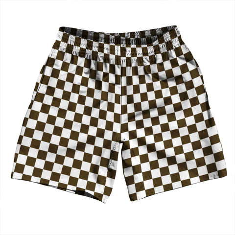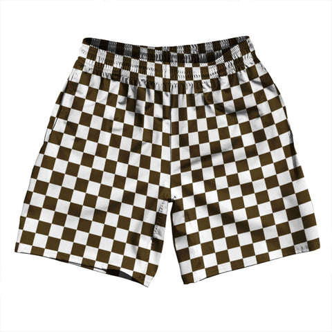 Product Story: Checkerboard 1 Inch Brown Dark and White 2.5" Swim Shorts Made in USAProduct Description: Checkerboard 1 Inch Brown Dark and White 2.5" Swim Shorts Made in USA Stripe 2.50" Inseam Swim Shorts Swim Trunks Board Shorts Bathing Suits Swim Suits Quick Drying Material Stretch Polyester Elastic Waistband Drawstring Side Pockets Made In USA