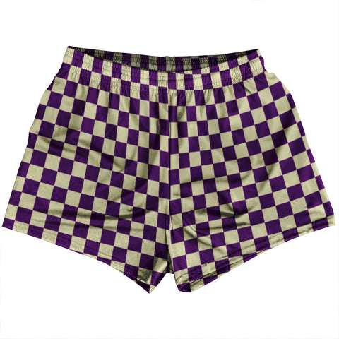 Product Story: Checkerboard 1 Inch Purple Medium and Vegas Gold Womens & Girls Sport Shorts End Made In USAProduct Description: Checkerboard 1 Inch Purple Medium and Vegas Gold Womens & Girls Sport Shorts End Made In USA Athletic Shorts Micro-Fiber Polyester Cooling Material Premium Lacrosse Product Elastic Drawstring Made in USA
