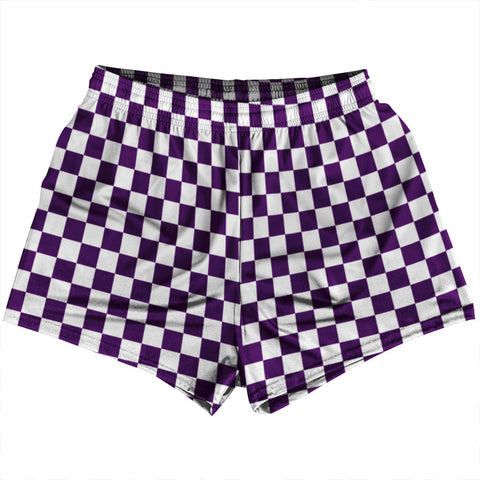 Product Story: Checkerboard 1 Inch Purple Medium and White Shorty Short Gym Shorts 2.5" Inseam Made In USAProduct Description: Checkerboard 1 Inch Purple Medium and White Shorty Short Gym Shorts 2.5" Inseam Made In USA Men's Short Shorts 2.5 Inseam No Pockets Athletic Microfiber Great For Inspiring Baby Making, Rugby, Running, Hoops, Racket Sports, Gym Class and Basket Weaving. Draw...
