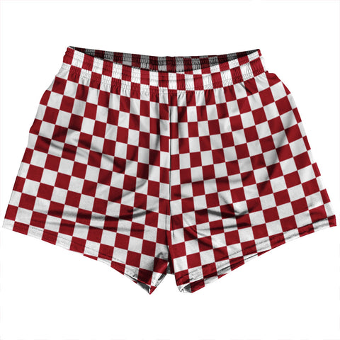 Product Story: Checkerboard 1 Inch Red Cardinal and White Shorty Short Gym Shorts 2.5" Inseam Made In USAProduct Description: Checkerboard 1 Inch Red Cardinal and White Shorty Short Gym Shorts 2.5" Inseam Made In USA Men's Short Shorts 2.5 Inseam No Pockets Athletic Microfiber Great For Inspiring Baby Making, Rugby, Running, Hoops, Racket Sports, Gym Class and Basket Weaving. Draw...