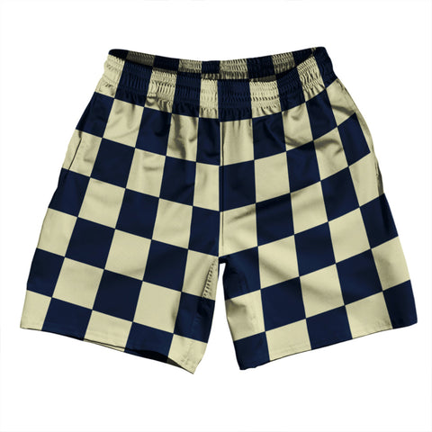 Product Story: Checkerboard 2.5 Inches Blue Navy and Vegas Gold Athletic Running Fitness Exercise Shorts 7" Inseam Shorts Made In USAProduct Description: Checkerboard 2.5 Inches Blue Navy and Vegas Gold Athletic Running Fitness Exercise Shorts 7" Inseam Shorts Made In USA Forever Color Sharpness Men's Gym Shorts 7 Inch Inseam Side Pockets Athletic Microfiber Great Sports Shorts Elastic Waist Draw...