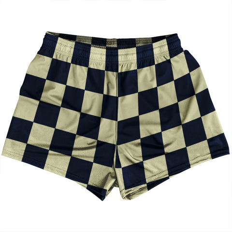 Product Story: Checkerboard 2.5 Inches Blue Navy and Vegas Gold Womens & Girls Sport Shorts End Made In USAProduct Description: Checkerboard 2.5 Inches Blue Navy and Vegas Gold Womens & Girls Sport Shorts End Made In USA Athletic Shorts Micro-Fiber Polyester Cooling Material Premium Lacrosse Product Elastic Drawstring Made in USA
