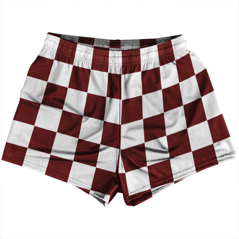 Product Story: Checkerboard 2.5 Inches Red Maroon and White Rugby Shorts Made In USAProduct Description: Checkerboard 2.5 Inches Red Maroon and White Rugby Shorts Made In USA Rep your, state, country or tribe in these fun Ruckus Rugby shorts. Rugby Shorts Polyester Sublimated Vibrant Print Premium Micro Fiber Side Pockets 4.5 Inch Inseam Elastic Drawstring Made In USA
