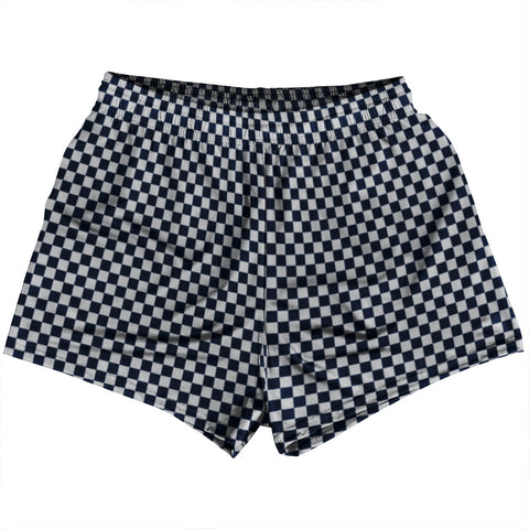 Product Story: Checkerboard Half Inch Blue Navy And Grey Medium Shorty Short Gym Shorts 2.5" Inseam Made In USAProduct Description: Checkerboard Half Inch Blue Navy And Grey Medium Shorty Short Gym Shorts 2.5" Inseam Made In USA Men's Short Shorts 2.5 Inseam No Pockets Athletic Microfiber Great For Inspiring Baby Making, Rugby, Running, Hoops, Racket Sports, Gym Class and Basket...