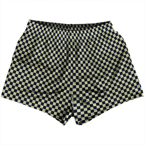 Product Story: Checkerboard Half Inch Blue Navy and Vegas Gold Shorty Short Gym Shorts 2.5" Inseam Made In USAProduct Description: Checkerboard Half Inch Blue Navy and Vegas Gold Shorty Short Gym Shorts 2.5" Inseam Made In USA Men's Short Shorts 2.5 Inseam No Pockets Athletic Microfiber Great For Inspiring Baby Making, Rugby, Running, Hoops, Racket Sports, Gym Class and Basket...