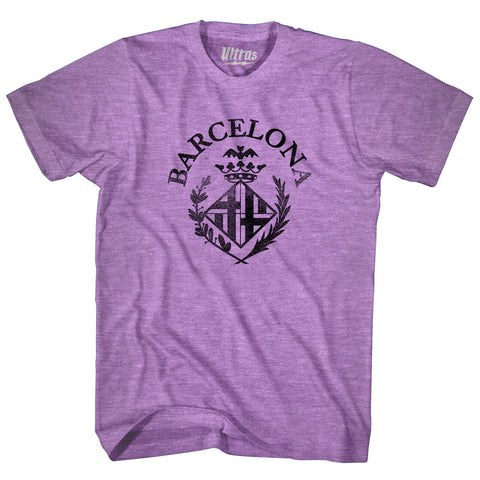 Product Story: Barcelona Vintage Soccer City Crest Adult Tri-Blend T-shirtProduct Description: Barcelona Vintage Soccer City Crest Adult Tri-Blend T-shirt Tri-Blend (Polyester, Rayon, Cotton) Buttery Smooth Soft Material Medium Weight Tee Soft Hand Print