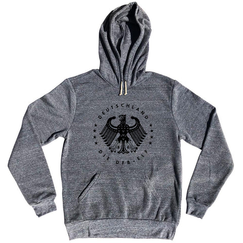 Product Story: Germany Eagle Deutschland Soccer 4 World Cups Tri-Blend HoodieProduct Description: Germany Eagle Deutschland Soccer 4 World Cups Tri-Blend Hoodie 6.5 oz. Tri-Blend Cozy Soft Material Pre-Shrunk Set-in sleeves Pouch front pocket Ribbed bottom band and sleeve cuffs