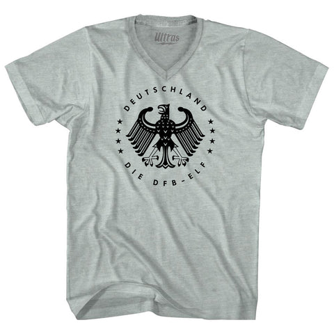Product Story: Germany Eagle Deutschland Soccer 4 World Cups Adult Tri-Blend V-neck T-shirtProduct Description: Germany Eagle Deutschland Soccer 4 World Cups Adult Tri-Blend V-neck T-shirt Tri-Blend (Polyester, Rayon, Cotton) Buttery Smooth Soft Material Medium Weight Tee Soft Hand Print