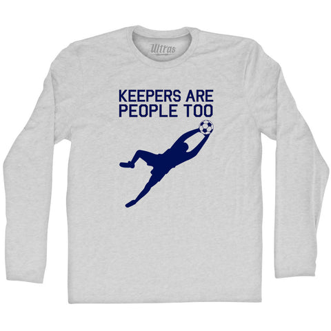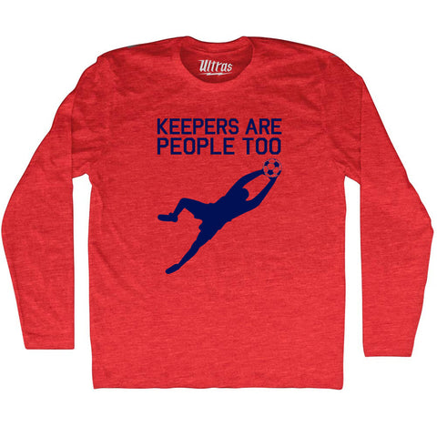 Product Story: Soccer Goal Keepers Are People Too Adult Tri-Blend Long Sleeve T-shirtProduct Description: Soccer Goal Keepers Are People Too Adult Tri-Blend Long Sleeve T-shirt Tri-Blend (Polyester, Rayon, Cotton) Buttery Smooth Soft Material Medium Weight Tee Soft Hand Print