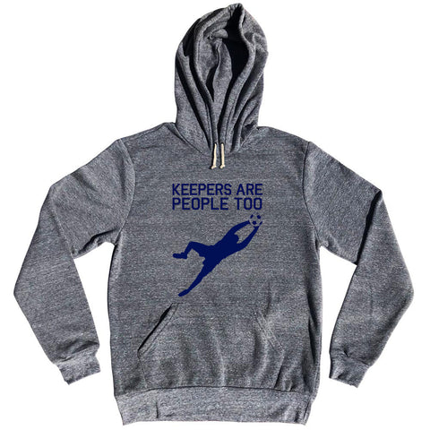 Product Story: Soccer Goal Keepers Are People Too Tri-Blend HoodieProduct Description: Soccer Goal Keepers Are People Too Tri-Blend Hoodie 6.5 oz. Tri-Blend Cozy Soft Material Pre-Shrunk Set-in sleeves Pouch front pocket Ribbed bottom band and sleeve cuffs