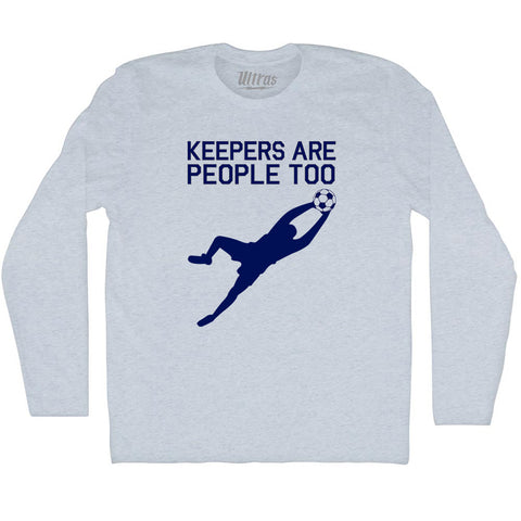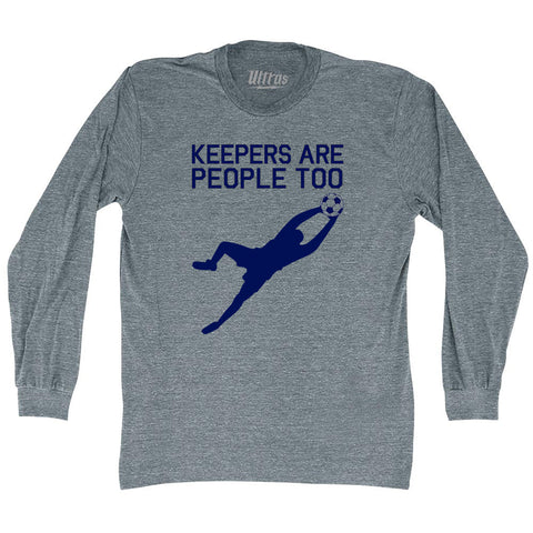 Product Story: Soccer Goal Keepers Are People Too Adult Tri-Blend Long Sleeve T-shirtProduct Description: Soccer Goal Keepers Are People Too Adult Tri-Blend Long Sleeve T-shirt Tri-Blend (Polyester, Rayon, Cotton) Buttery Smooth Soft Material Medium Weight Tee Soft Hand Print
