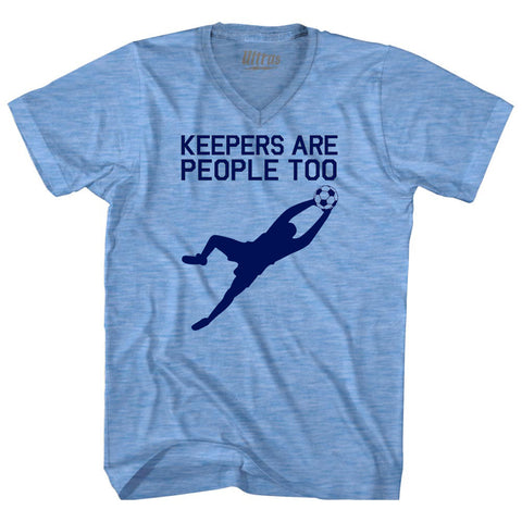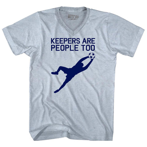 Product Story: Soccer Goal Keepers Are People Too Adult Tri-Blend V-neck T-shirtProduct Description: Soccer Goal Keepers Are People Too Adult Tri-Blend V-neck T-shirt Tri-Blend (Polyester, Rayon, Cotton) Buttery Smooth Soft Material Medium Weight Tee Soft Hand Print