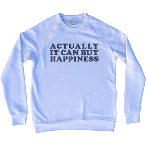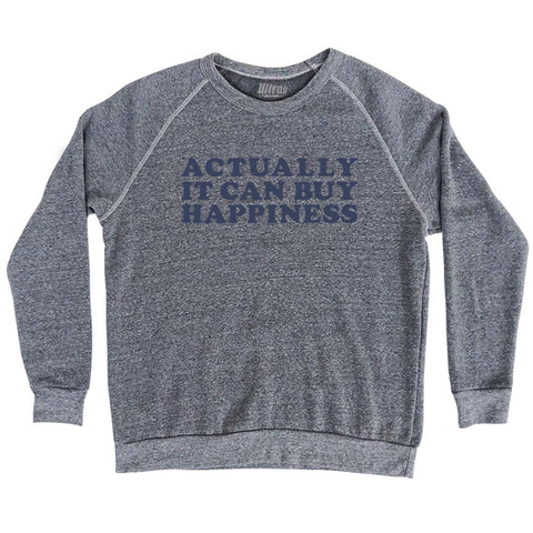 Product Story: Actually It Can Buy Happiness Adult Tri-Blend SweatshirtProduct Description: Actually It Can Buy Happiness Adult Tri-Blend Sweatshirt Tri-Blend (Polyester, Rayon, Cotton) Buttery Smooth Soft Material Medium Weight Tee Soft Hand Print