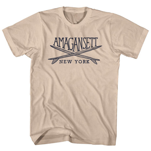 Product Story: Amagansett Surf Break Crossed Surf Board Surfing Destination Adult Cotton T-ShirtProduct Description: Amagansett Surf Break Crossed Surf Board Surfing Destination Adult Cotton T-Shirt Cotton Buttery Smooth Soft Material Medium Weight Tee Soft Hand Print