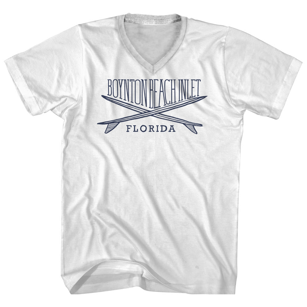 - Boynton Beach Inlet Surf Break Crossed Surf Board Surfing Destination Adult Cotton V-Neck T-Shirt