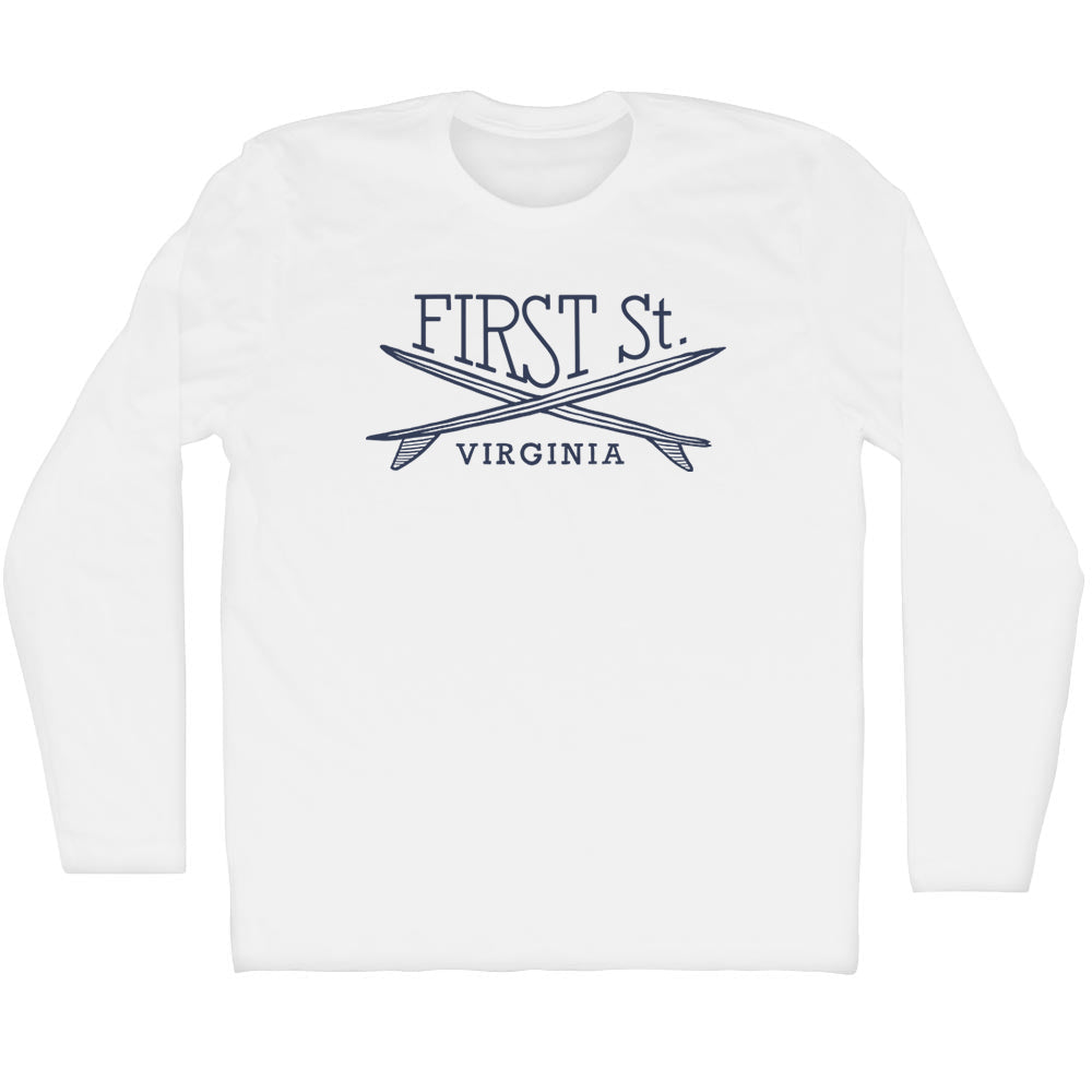 - First St. Surf Break Crossed Surf Board Surfing Destination Adult Cotton Long Sleeve T-Shirt
