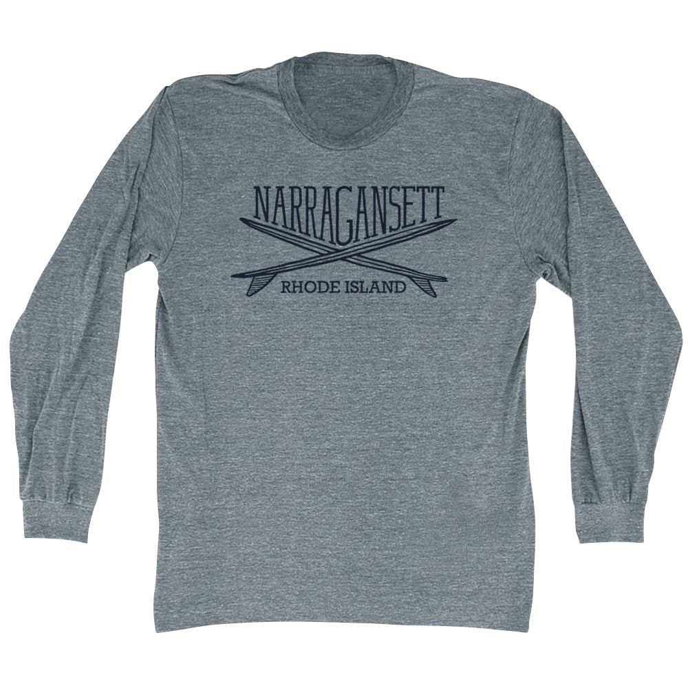 - Narragansett Surf Break Crossed Surf Board Surfing Destination Adult Tri-Blend Long Sleeve T-Shirt