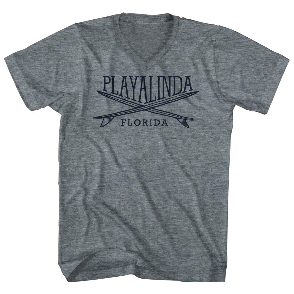 - Playalinda Surf Break Crossed Surf Board Surfing Destination Adult Tri-Blend V-Neck T-Shirt