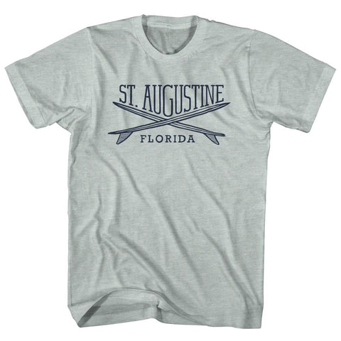 Product Story: St. Augustine Surf Break Crossed Surf Board Surfing Destination Adult Tri-Blend T-ShirtProduct Description: St. Augustine Surf Break Crossed Surf Board Surfing Destination Adult Tri-Blend T-Shirt Tri-Blend (Polyester, Rayon, Cotton) Buttery Smooth Soft Material