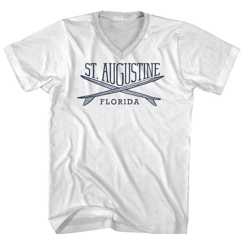Product Story: St. Augustine Surf Break Crossed Surf Board Surfing Destination Adult Cotton V-Neck T-ShirtProduct Description: St. Augustine Surf Break Crossed Surf Board Surfing Destination Adult Cotton V-Neck T-Shirt Cotton Buttery Smooth Soft Material Medium Weight Tee Soft Hand Print
